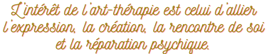 Là où il y a souffrance, difficulté, besoin de s’épanouir, nécessité de comprendre, …. l’art-thérapie a sa place. Et ceci ouvre un champ immense des possibles au-delà des frontières de mon cabinet, pour l’art-thérapeute que je suis. Je suis intervenue dans diverses structures médico-sociales, éducatives, culturelles et institutionnelles (IME, Pension de Famille, Centre Social, Crèches, Ecoles, …).